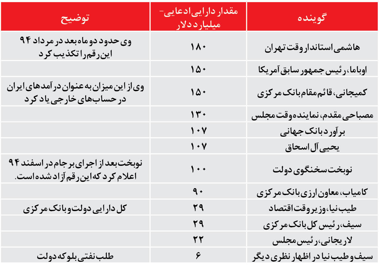 همانطور که اشاره شد، موضوع، قبل از امضای برجام و با برخی اظهارنظرها داغ شد. برخی ارقام نجومی درباره دارایی های بلوکه شده ایران اعلام و بعدها معلوم شد بسیار مبالغه آمیز بوده است. ضمنا این افراد تفکیک و توضیحی درباره نوع دارایی ها هم اعلام نکردند و جامعه و افکار عمومی را به این اشتباه انداختند که بعد از برجام، این مقدار پول ( از 29 تا 180 میلیارد دلار) در اختیار ایران قرار خواهد گرفت و به عنوان درآمد جاری مازاد قابل استفاده خواهد بود. در حالی که واقعیت این گونه نبود. جدول زیر ارقام مختلف اعلام شده توسط افراد مختلف درباره دارایی های بلوکه شده را نشان می دهد.