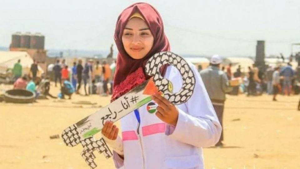رزان النجار، پرستاری ۲۱ ساله و از نیروهای داوطلب تیم پزشکی بود. نیروهای صهیونیستی زمانی به سمت او شلیک کردند که خانم نجار روپوش سفید پزشکی به تن داشت، دستانش را بالا برده بود و برای نجات یکی از معترضان زخمی به سمت حصارهای مرزی سرزمینهای اشغالی میرفت.