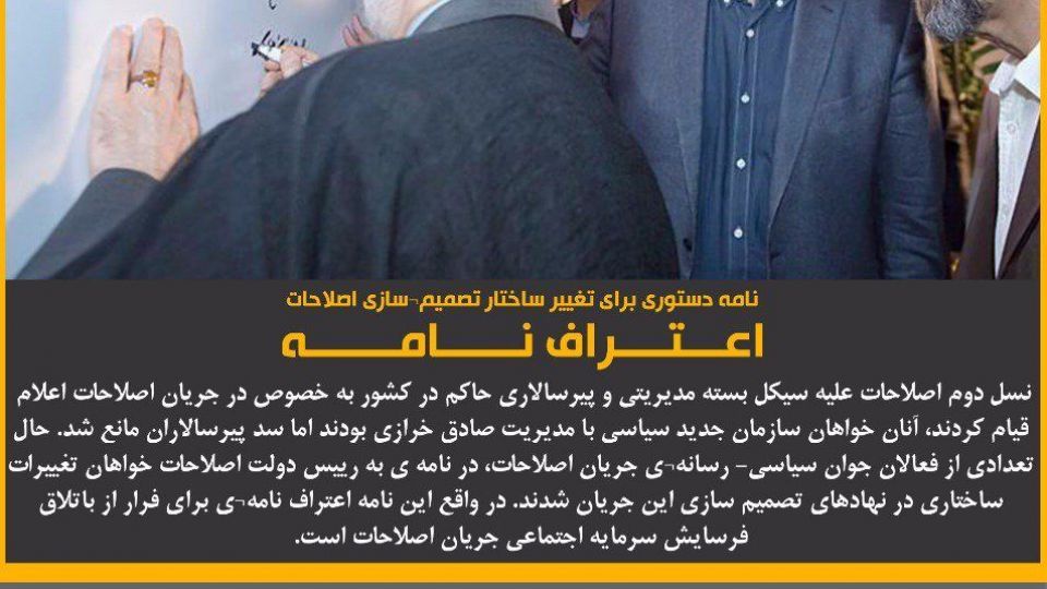 تعدادی از فعالان جوان سیاسی- رسانه جریان اصلاحات، در نامه به رییس دولت اصلاحات، خواهان تغییرات ساختاری در نهادهای تصمیمسازی این جریان شدند. درواقع این نامه اعترافنامه برای فرار از باتلاق فرسایش سرمایه اجتماعی جریان اصلاحات است، در گذشته این کنشگران سیاسی واقعیتهای حاکم را تکذیب میکردند ولی در وضعیت حاکم به عدم شفافیت، استمرار لابیگری به جای شایستهگزینی، فقدان موازین دموکراسیخواهی با حاکمیت فردمحور در تصمیمسازی اذعان دارند.