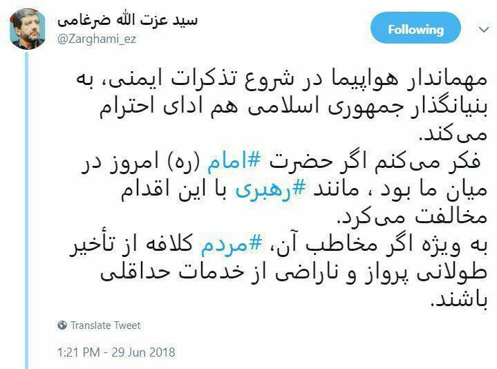 توئیت جالب ضرغامی درباره صحبتهای مهماندار هواپیما و کنایه به شرکتهای هواپیمایی گروه عکس الف، ۹ تیر ۱۳۹۷، ۱۱:۱۵ 3970409120 ۲ نظر، ۰ در صف انتشار و ۱۳ تکراری یا غیرقابل انتشار