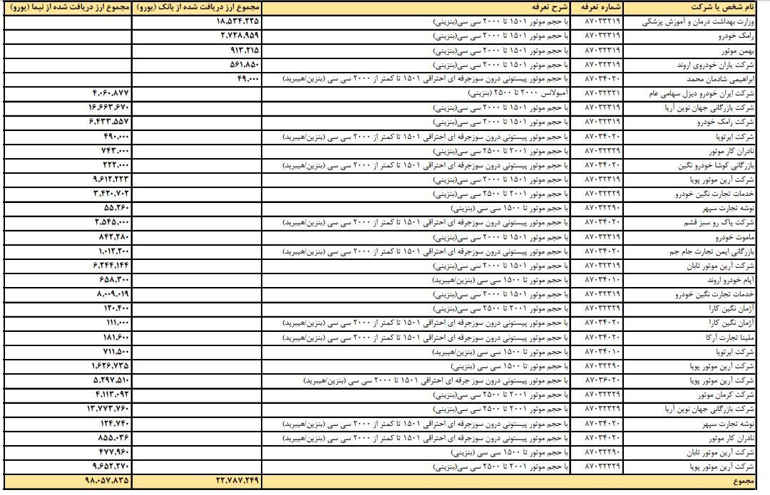 گفتنی است در ستاد اقتصادی دولت مقرر شده است بانک مرکزی با هماهنگی دستگاه های ذیربط و مسئول، نسبت به انتشار فهرست دریافت کنندگان ارز رسمی اقدام کند. بر این اساس در ادامه انتشار نخستین فهرست شرکت های دریافت کننده ارز توسط بانک مرکزی در روز یکشنبه دهم تیرماه، فهرست زیر که حاوی میزان تامین ارز رسمی برای واردات خودرو می باشد و از سوی وزارت صنعت، معدن و تجارت در اختیار قرار گرفته ست، منتشر می شود.