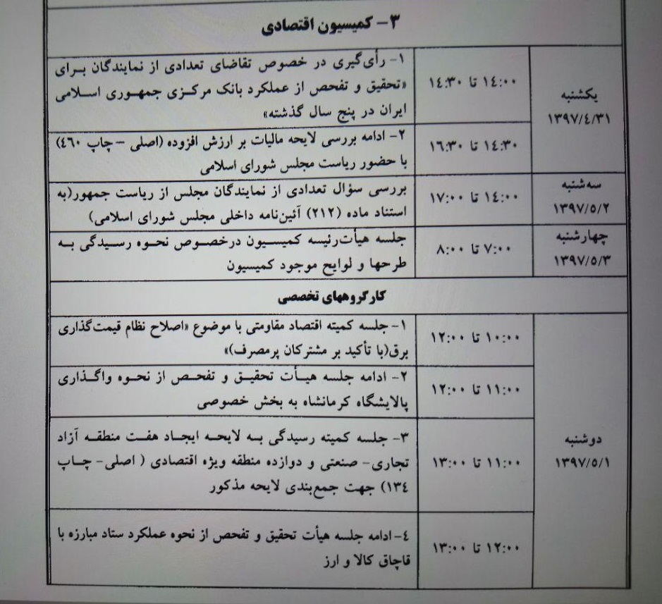 به گزارش خبرنگار الف، در دستور کار بعدازظهر روز سه شنبه هفته آینده کمیسیون اقتصادی مجلس آمده که سوال تعدادی از نمایندگان از رئیس جمهور به استناد ماده 212 آئین نامه داخلی مجلس بررسی می شود.