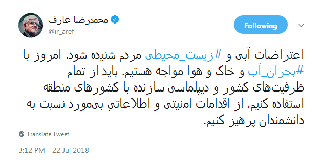 به گزارش الف، محمدرضا عارف در صفحه شخصی خود در توییتر نوشت: «اعتراضات آبی و زیست محیطی مردم شنیده شود. امروز با بحران آب، خاک و هوا مواجه هستیم باید از تمام ظرفیتهای کشور و دیپلماسی سازنده با کشورهای منطقه استفاده کنیم و از اقدامات امنیتی و اطلاعاتی بیمورد نسبت به دانشمندان پرهیز کنیم.»