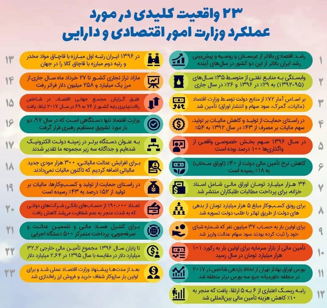 این گزارش با یادآوری اینکه وزارت اقتصاد تنها دستگاهی است که در سال ۱۳۹۷ دو بار مورد تشویق مستقیم مقام معظم رهبری قرار گرفته است، معرفی این وزارتخانه به عنوان دستگاه برتر در زمینه دولت الکترونیک و تقدیر جداگانه از سه زیر مجموعه آن را به عنوان بخشی دیگر از موفقیت های وزارت متبوع مورد اشاره قرار میدهد.