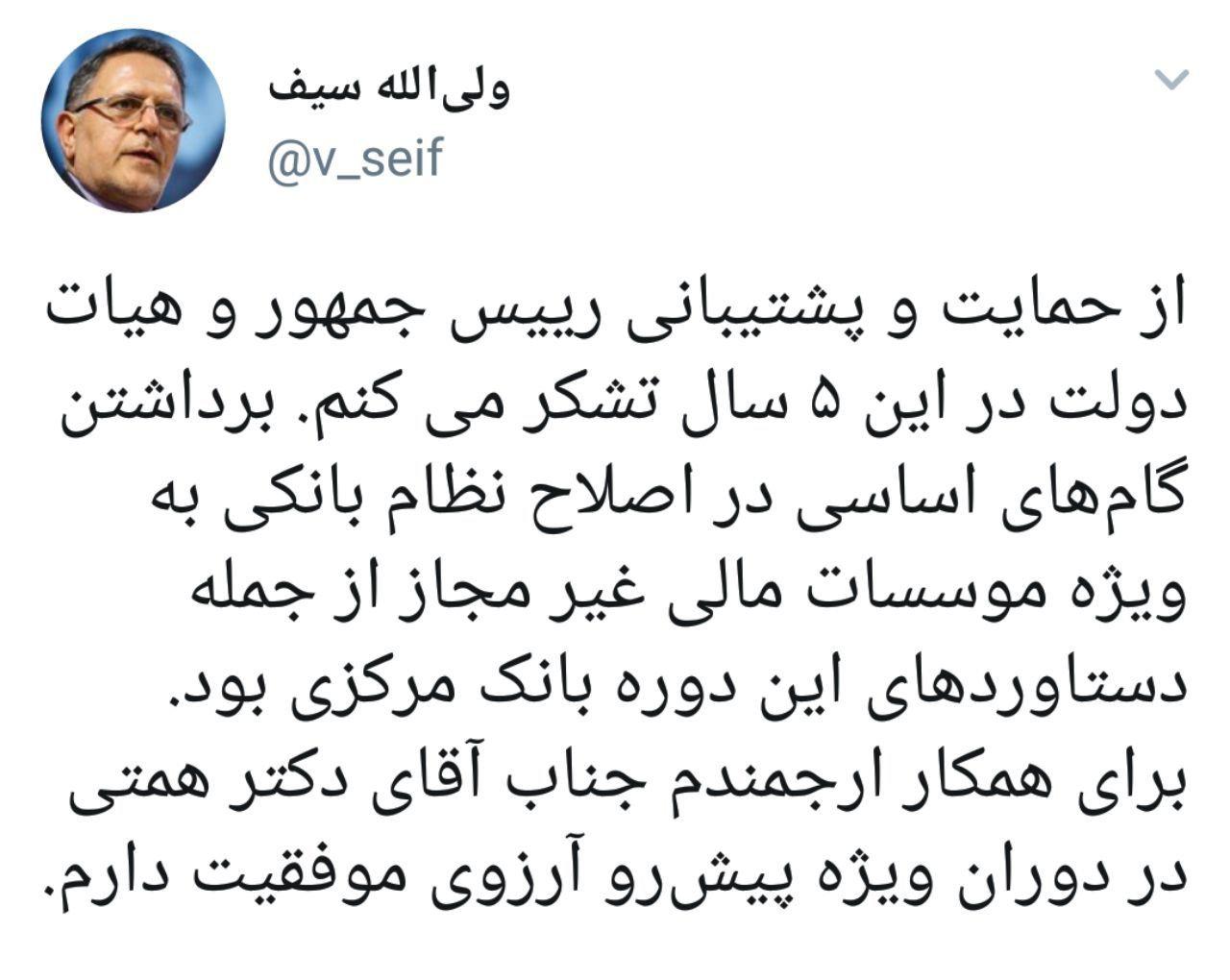 به گزارش الف، ولی الله سیف بعد از برکناری از ریاست بانک مرکزی در توییتر خود با ذکر دستاوردهای بانک مرکزی در مدت ریاستش نوشت: از حمایت و پشتیبانی رییس جمهور و هیات دولت در این ۵ سال تشکر میکنم. برداشتن گام های اساسی در اصلاح نظام بانکی به ویژه موسسات مالی غیرمجاز از جمله دستاوردهای این دوره بانک مرکزی بوده است.