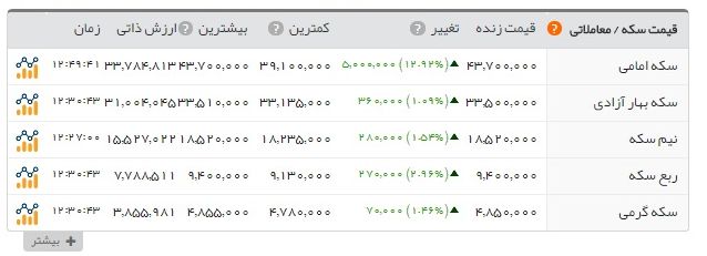 قیمت سکه در حدود ساعت ۱۳ ظهر امروز به ۴ میلیون و سیصد و هفتاد هزار تومان رسید و حتی این قیمت تا ۴ میلیون و چهارصد هزار تومان هم رسید.