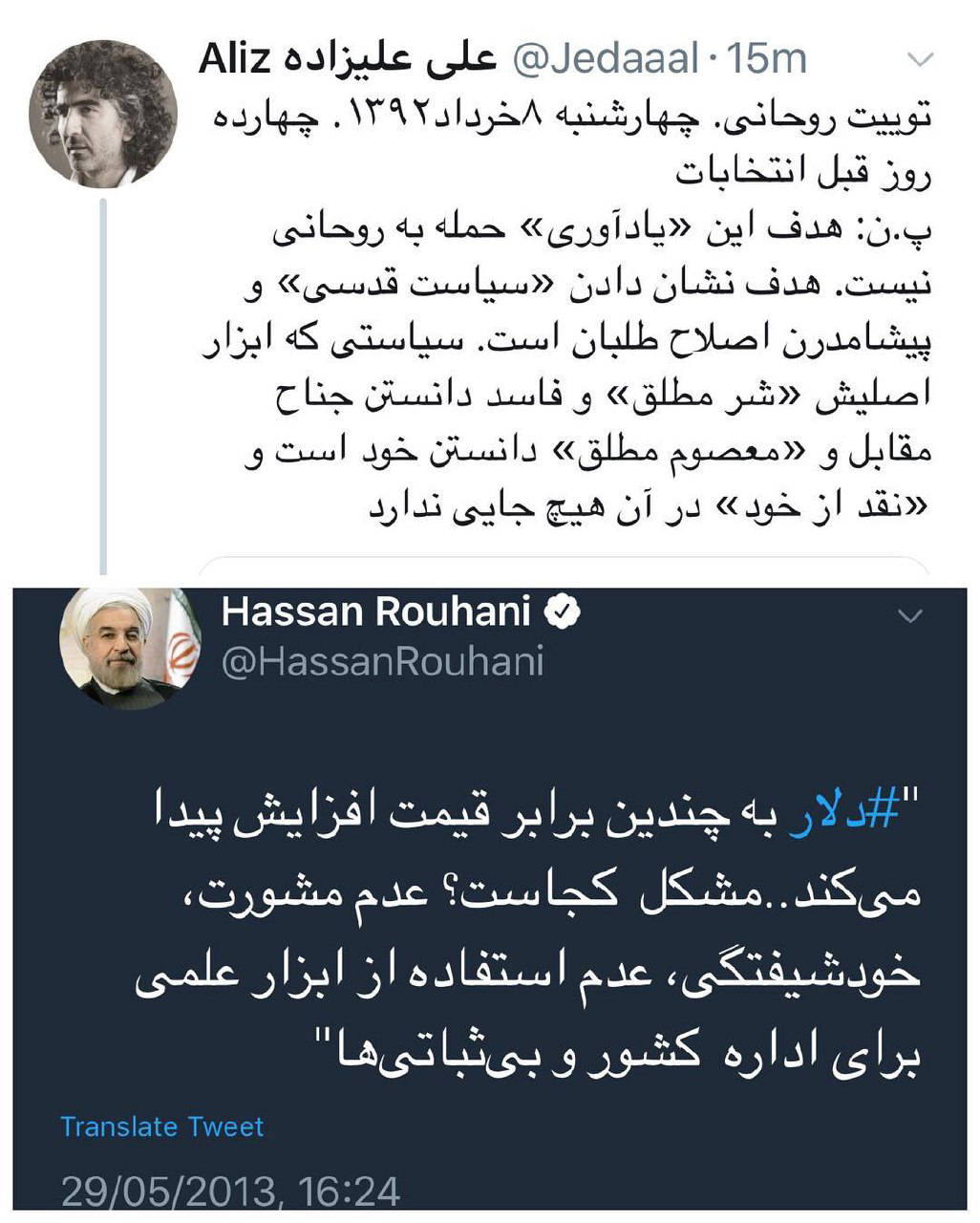 هدف من از «یادآوری» این توییت حمله به شخص حسن روحانی نیست. هدف نشان دادن «سیاست قدسی» و پیشامدرن اصلاح طلبان است. سیاستی که ابزار اصلیش «شر مطلق» و فاسد دانستن جناح مقابل و «معصوم مطلق» دانستن خود است و «نقد از خود» و نگاه تاریخی در آن هیچ جایی ندارد...