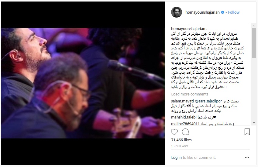 «عزیزان، در این ایام که چون سیاوش در گذر از آتش هستیم نمیدانم چه کنیم تا حالمان کمی به شود، چنانچه مشکل مجوز نباشد سراپا در خدمتم تا بدون هیچ انتفاعی کنسرت خیابانی گسترده برای شما عزیزان اجرا کنم، شاید دلمان در کنار یکدیگر آرام گیرد. دوستان مهربانم، در پاسخ به پیگیری شما عزیزان به اطلاعتان میرسانم از اجرای کنسرت «ایران من» در سال گذشته که نیت کرده بودیم به قسمتی از درد و رنج زلزلهزدگان کرمانشاه بپردازیم، چنین مقرر شد که با نظارت و همت دوست گرامی جناب متین، مجموعا چهارصد یخچال و کولر تهیه و به خانوادههای مصیبت دیده اهدا شود. باشد که این ناقابل مقبول درگاه معشوق قرار گیرد. سلامت و برقرار باشید.»