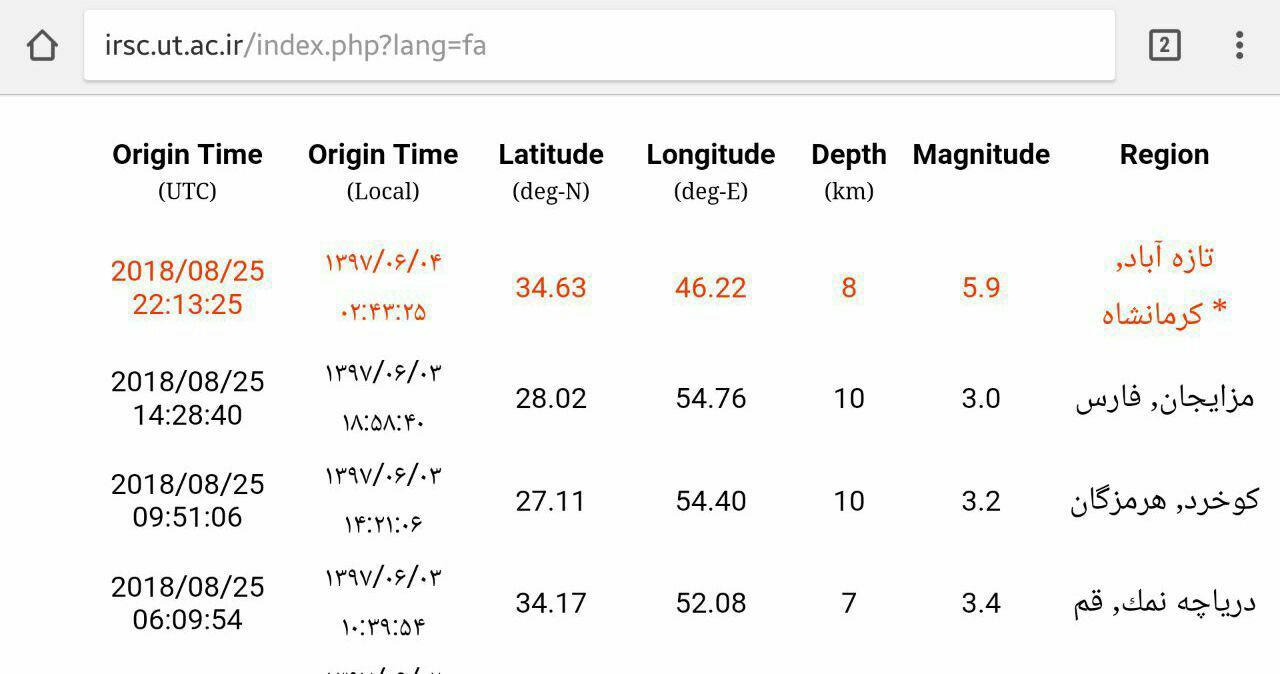 وی افزود: بر اساس گزارش اولیه مرکز لرزه نگاری کشوری موسسه ژئوفیزیک دانشگاه تهران این زمین لرزه به بزرگی 5.9 ریشتر به مرکزیت تازه آباد، ریجاب-کرمانشاه ساعت ۲ و ۴۳ دقیقه و ۲۵ ثانیه بامداد در عمق ۸ کیلومتری زمین روی داده است.