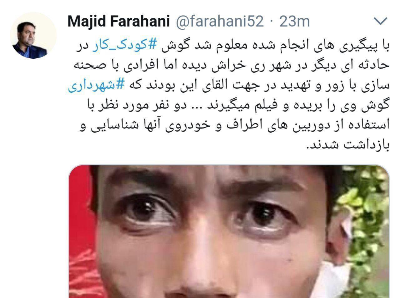 به گزارش الف، مجید فراهانی صبح امروز در صفحه توییتر خود نوشت: "با پیگیریهای انجام شده، معلوم شد گوش کودک کار در حادثهای دیگر در شهرری خراش دیده اما افرادی با صحنهسازی با زور و تهدید در جهت القای این بودند که شهرداری گوش وی را بریده و فیلم میگیرند.