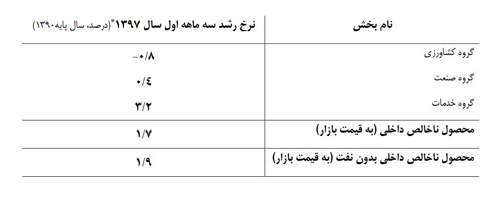 به گزارش الف به نقل از مرکز آمار ایران، محصول ناخالص داخلی به قیمت ثابت سال ۱۳۹۰ در سه ماهه نخست سال جاری به رقم ۱۸۲۸۴۴۰ میلیارد ریال با نفت و ۱۴۱۱۳۸۵ میلیارد ریال بدون احتساب نفت رسیده است، در حالی که رقم مذکور در مدت مشابه سال قبل با نفت ۱۷۹۷۶۶۳ میلیارد ریال و بدون نفت ۱۳۸۴۵۸۹ میلیارد ریال بوده که نشان از رشد ۱,۷ درصدی محصول ناخالص داخلی با نفت و ۱.۹ درصدی محصول ناخالص داخلی بدون نفت در سه ماهه اول سال ۱۳۹۷ دارد.