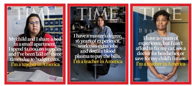 به گزارش الف، مجله تایم در جدیدترین شماره خود با چاپ تصویر و نقل قولی از یک معلم، به انعکاس وضعیت دشوار معلمان آمریکایی و مشکلات مالی آنها پرداخته است. بر روی جلد شماره ماه سپتامبر این نشریه از زبان یک معلم زن آمریکایی نوشته شده: من مدرک کارشناسی ارشد دارم با ۱۶ سال سابقهی کار اما مجبورم دو جای دیگر هم کار کنم و پلاسمای خونم را هم بفروشم تا بتوانم قبضهایم را پرداخت کنم؛ من یک معلم آمریکایی هستم.