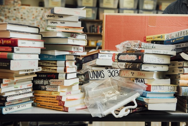 انبوه کتابهایی که در کلاس درس "بین تای" در دانشگاه نیبرهود میدل اسکول واقع در نیویورک سیتی روی هم چیده شدهاند
