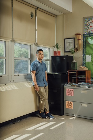 "بین تای" معلم علوم انسانی در کلاس درسش در دانشگاه نیبرهود میدل اسکول واقع در نیویرک سیتی ۱۶ آگوست