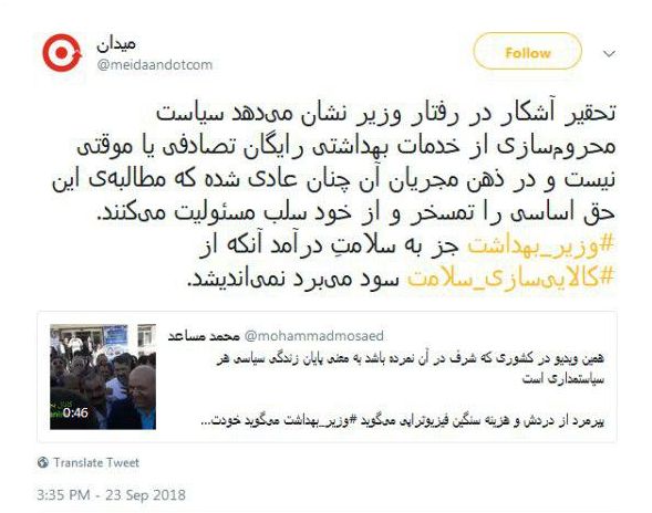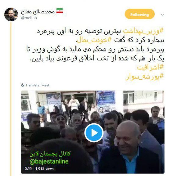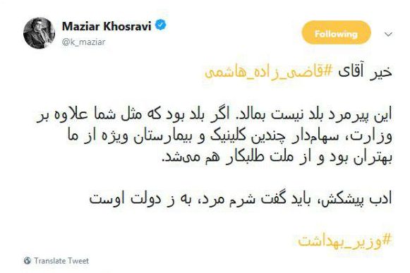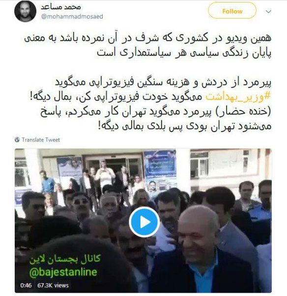 به گزارش الف به تازگی فیلمی از وزیر بهداشت در فضای مجازی منتشر شده که در آن قاضیزاده هاشمی به پیرمردی که از هزینههای فیزیوتراپی گله میکند، میگوید: فیزیوتراپی کاری ندارد باید بمالید، خودتان انجام دهید.