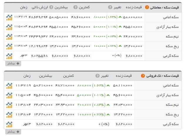 طبق آخرین قیمتهای ثبت شده و معاملات انجام شده در بازار قیمت سکه لحظاتی قبل (ساعت ۱۱:۴۷ امروز) به ۵ میلیون رسید.