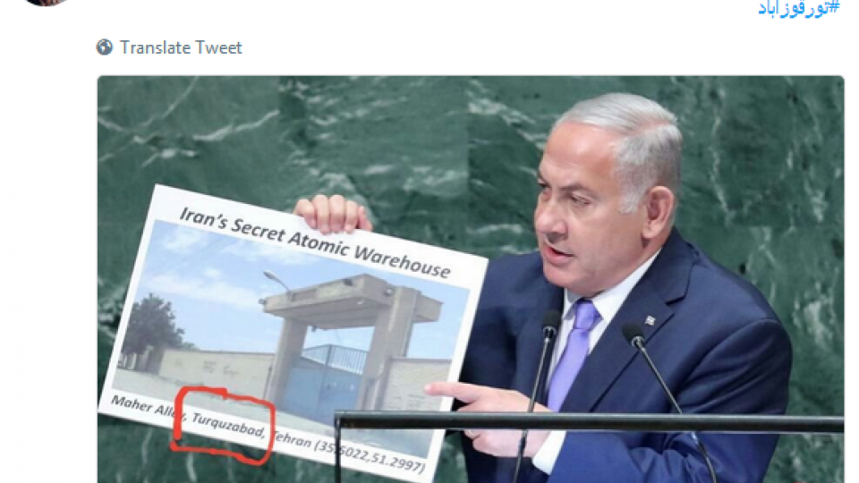 نخستوزیر رژیم صهیونیستی همانند نمایشهای قبلی خود با نشاندادن تصاویری مدعی شد اسرائیل محل مخفیانه اسناد محرمانه برنامه اتمی ایران را در منطقهای نزدیک تهران به دست آورده است. وی در صحبتهای خود درباره یک مکان سری در تهران صحبت کرد و گفت: ایران یک مکان هسته ای سری دیگر در تهران دارد. در ماه مه ما محل انباشت اسناد هسته ای ایران را در شورآباد تهران فاش کردیم. اکنون میخواهم فاش کنم که ایران دارای یک انبار سری هسته ای دیگر در تورقوزآباد(دوقوزآباد) تهران است.