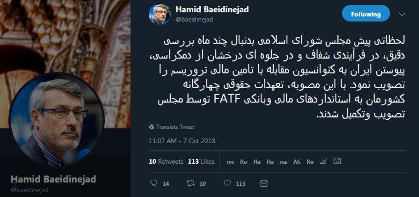 به گزارش الف، حمید بعیدینژاد در صفحه توییترش نوشت: لحظاتی پیش مجلس شورای اسلامی بدنبال چند ماه بررسی دقیق، در فرآیندی شفاف و در جلوه ای درخشان از دموکراسی، پیوستن ایران به کنوانسیون مقابله با تامین مالی تروریسم را تصویب نمود. با این مصوبه، تعهدات حقوقی چهارگانه کشورمان به استانداردهای مالی و بانکی FATF توسط مجلس تصویب و تکمیل شدند.