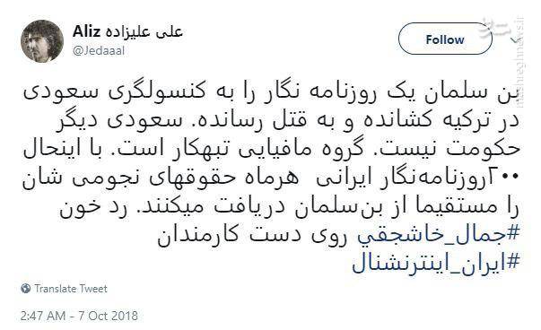«علی علیزاده» در توئیتی درباره قتل روزنامه نگار سعودی نوشت: