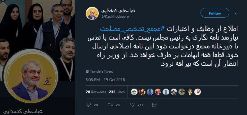 عباسعلی کدخدایی عضو حقوقدان و سخنگوی شورای نگهبان با انتشار پستی در صفحه شخصی خود در توئیتر، نسبت به نامهنگاری اخیر وزیر راه و شهرسازی با رئیس مجلس در خصوص وظایف و اختیارات هیات عالی نظارت مجمع تشخیص مصلحت نظام، واکنش نشان داد و نوشت: «اطلاع از وظایف و اختیارات مجمع تشخیص مصلحت، نیازمند نامهنگاری به رئیس مجلس نیست. کافی است با تماس با دبیرخانه مجمع، درخواست شود آییننامه اصلاحی ارسال شود. قطعا همه ابهامات بر طرف خواهد شد. از وزیر راه انتظار آن است که بیراهه نرود».