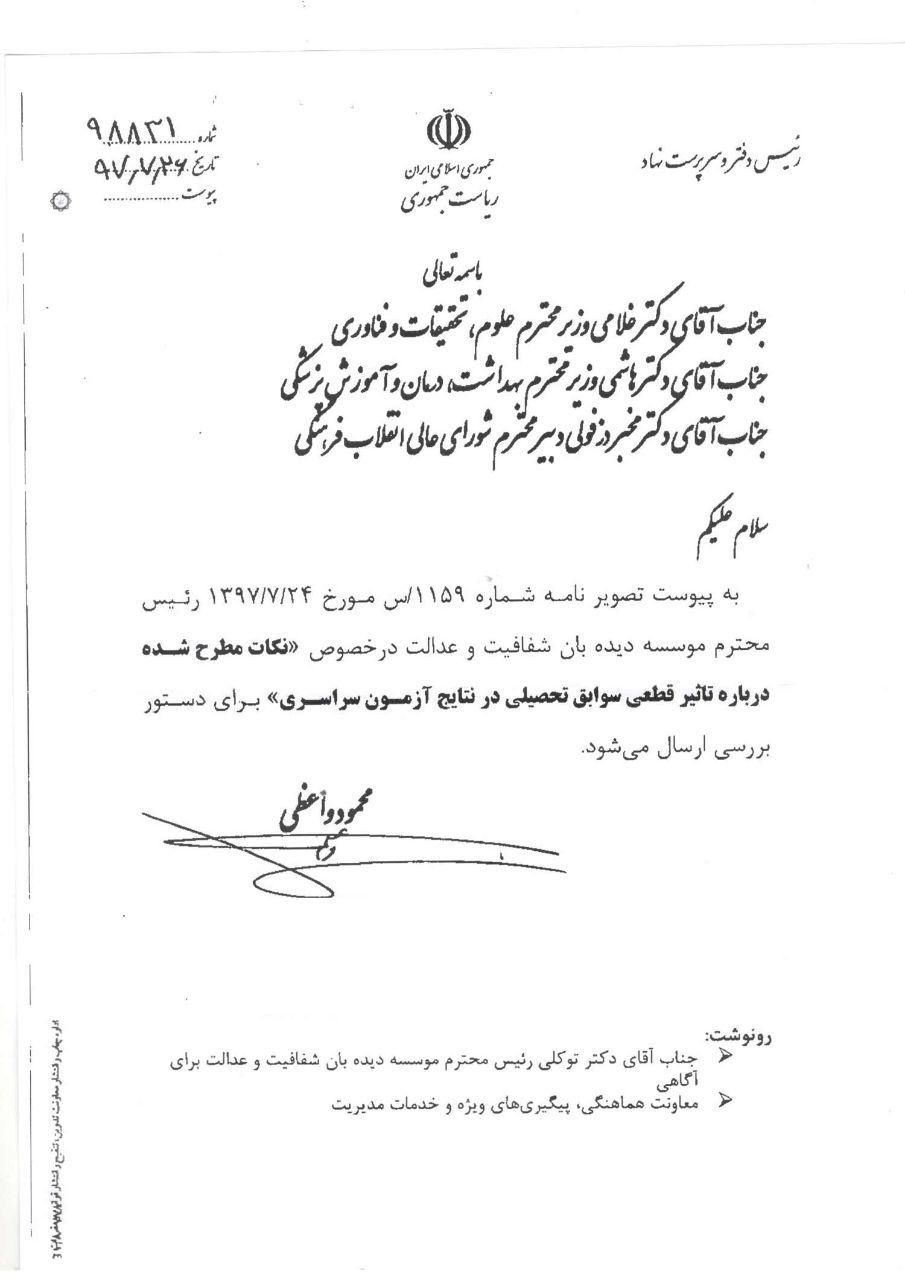 به گزارش الف، هفته گذشته رئیس هیات مدیره دیدهبان شفافیت و عدالت طی نامهای به رئیس محترم دفتر رئیسجمهور نسبت به پیامدهای تاثیر قطعی سوابق تحصیلی در نتایج آزمون سراسری هشدار داده بود و اعلام نموده بود دیدهبان در این چند ماهِ پس از تصویب تاثیر قطعی معدل در شورای سنجش و پذیرش دانشجو، تلاش کرده دانش آموزان معترض را به سوی راههای مدنی برای اعتراض راهنمایی کند. پیرو آن دکتر واعظی این نامه را برای آقایان دکتر غلامی، دکتر قاضیزاده هاشمی و دکتر مخبر دزفولی با دستور بررسی ارسال نموده است.