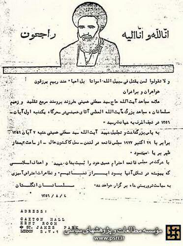 اطلاعیه درگذشت سیدمصطفی خمینی در آبان 1356 گروه عکس الف، ۳ آبان ۱۳۹۷، ۱۱:۱۵ 3970803067 ۶ نظر، ۰ در صف انتشار و ۲ تکراری یا غیرقابل انتشار