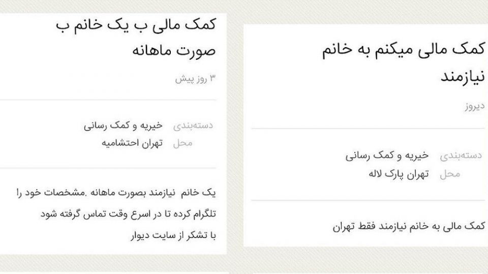سایت دیوار یکی از سایتهای اعلام آگهی است که در همین چند سالی که راه افتاده، طرفدارهای خودش را پیدا کرده است و اتفاقا جای خوبی برای فروش چیزهاییست که نیاز ندارید. اما در یکی دو هفته گذشته آگهیهای عجیبی در این سایت منتشر شد؛ «کمک مالی به خانم»، «کمک مالی و غیر مالی»، «کمک مالی به خانم نیازمند»، «کمک مالی به خانم دانشجو» و .... عنوان این آگهیهاست.