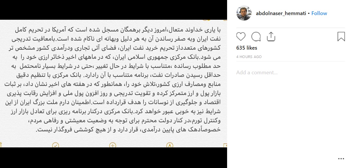 به گزارش الف، رئیس کل بانک مرکزی ایران در صفحه اینستاگرام خود نوشت: با یاری خداوند متعال امروز دیگر بر همگان مسجل شد که آمریکا در تحریم کامل نفت ایران و به صفر رساندن آن به هر دلیل و بهانه ای ناکام شده است.