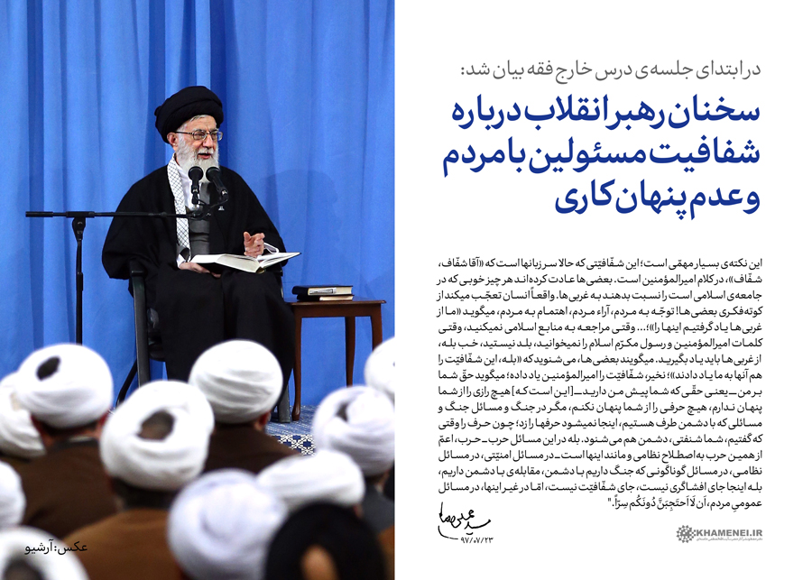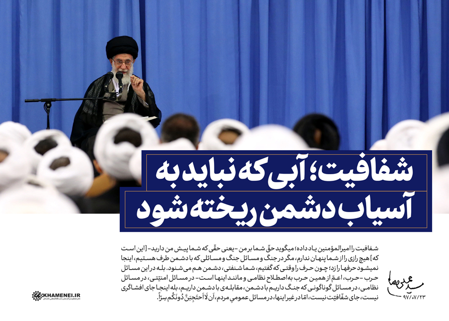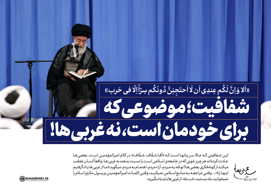 به گزارش الف، حضرت آیتالله خامنهای روز دوشنبه (۹۷/۷/۲۳) در ابتدای جلسهی درس خارج فقه، فرازی از نامهی حضرت امیرالمومنین (علیهالسلام) خطاب به مسئولان و فرماندهان نظامی را خواندند و این نامه را بهمثابهی دستورالعملی برای همهی مدیران نظام اسلامی دانستند. در فرازی از این نامه، موضوع شفافیت مسئولان مطرح شده است: «اَلا وَ اِنَّ لَکُم عِندِی اَن لَا اَحتَجِبَنَّ دُونَکُم سِرّاً اِلّا فی حَرب»، «بدانید حقّ شما بر من است که چیزی را از شما جز اسرار جنگ پنهان ندارم». این موضوع مورد استقبال گستردهی رسانهها قرار گرفت؛ هرچند پیش از این نیز بارها ابعاد مختلف «شفافیت» در بیانات رهبر انقلاب اسلامی مورد توجه و تاکید قرار گرفته بود. این یادداشت تلاش میکند سابقهی این بحث در بیانات رهبر حکیم انقلاب اسلامی را مرور کند.