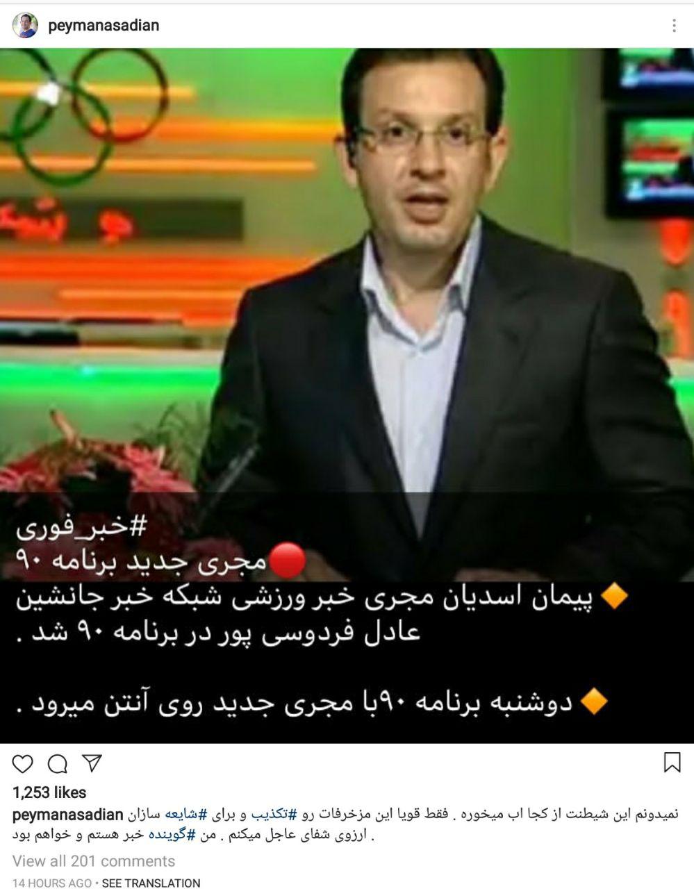 این خبر اما خیلی زود تکذیب شد. خود اسدیان در صفحه اینستاگرامش این خبر را تکذیب کرد. مشکلاتی که فردوسیپور با مدیران شبکه سه دارد هنوز حل نشده اما هنوز خبری درباره تغییر مجری برنامه ۹۰ منتشر نشده. مساله این است که عادل فقط مجری برنامه 90 نیست بلکه تهیه کننده هم هست. پس باید مجری جدید کار تهیه کنندگی برنامه را هم بر عهده بگیرد یا اینکه یک فرد دیگر جداگانه این کار را انجام بدهد.