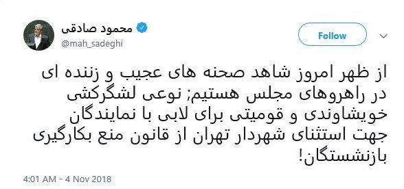 توئیت محمود صادقی از لشگرکشی در مجلس برای افشانی