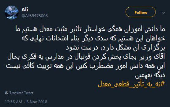 گروه اجتماعی الف، 3970814067برخی دانش آموزان در فضای مجازی با انتشار توییتهایی از وزیر آموزش و پرورش درخواست کرده به مشکلات آنها و تاثیر قطعی معدل و.. رسیدگی کنند.
