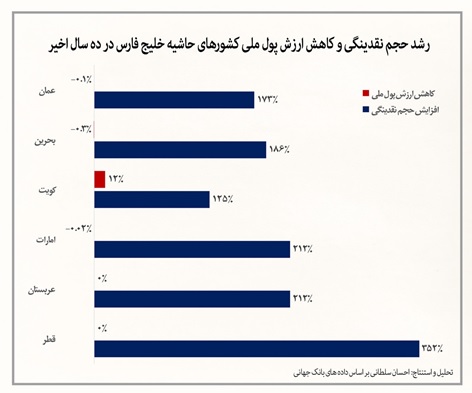 در طول ۱۰ سال اخیر حجم نقدینگی در شش کشور عربی عضو شورای همکاری خلیج فارس بین ۱۲۵ تا ۳۵۲ درصد افزایش پیدا کرد، اما در پنج کشور نرخ تبدیل ارز ثابت ماند و فقط در یک کشور ۱۲درصد بالا رفت.روند مستمر خلق پول برای تامین مخارج رو به رشد دولتها و فعالیت بخشهای شبه دولتی و شبه خصوصی وابسته آنها، در عمل منجر به تشکیل یک اقتصاد ضعیف، غیر مردمی و نامولد شده است.