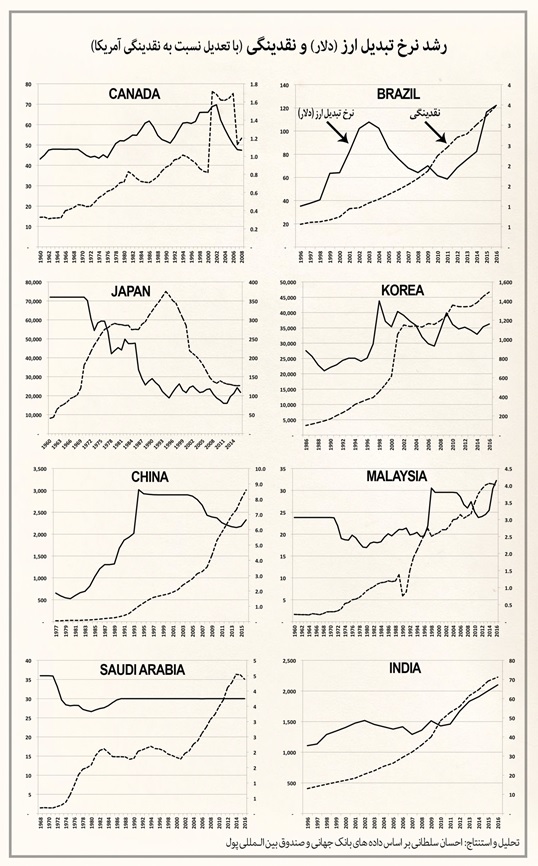 بر اساس دادههای بانک مرکزی در طول دوره ۱۳۴۰-۵۶ که نرخ ارز ۷درصد کاهش یافت، حجم نقدینگی ۳۷ برابر و در دوره ۱۳۷۸-۸۹ که نرخ ارز ۲۰ درصد افزایش یافت، حجم نقدینگی ۱۵ برابر گردید.