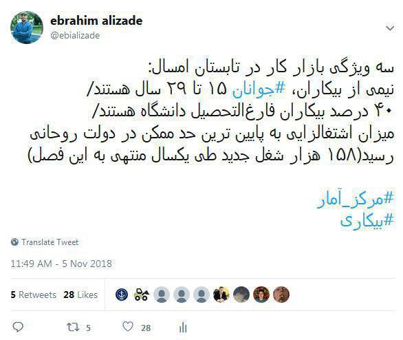 ابراهیم علیزاده فعال رسانه در توییتی نوشت: نیمی از بیکاران جوان هستند و 40 درصد بیکاران فارغالتحصیل دانشگاه!