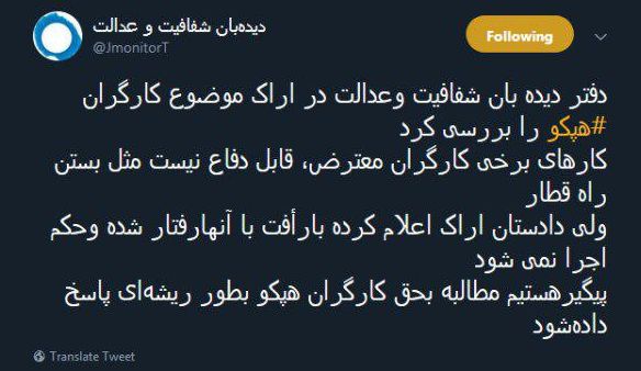 گروه اجتماعی الف، 3970827106دیدهبان شفافیت و عدالت از بررسی موضوع کارگران هپکو اراک خبر داد و اعلام کرد پیگیر مطالبه بحق کارگران هستیم.