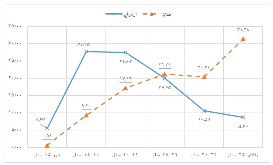 طبق نمودار فوق پدیدهی طلاق در زنانی که در سنین بالای ۳۰ سال ازدواج میکنند بیش از ۵ برابر زنانی است که در سنین زیر ۲۰ سال ازدواج می کنند.