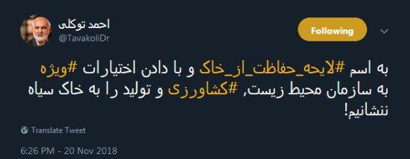 احمد توکلی عضو مجمع تشخیص مصلحت نظام به لایحه حفاظت از خاک، در صفحه شخصی خود واکنش نشان داد.