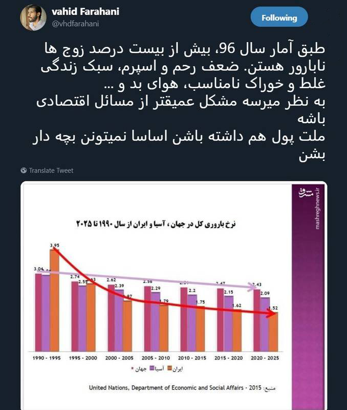 یک فعال رسانه در صفحه خود در توییتر با درج نموداری از دلایل کاهش جمعیت و نرخ باروری در ایران نوشت.