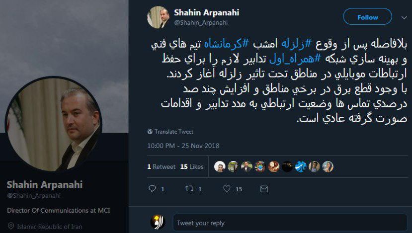 گروه اجتماعی الف، 3970905153شاهین آرپناهی مدیرکل ارتباطات همراه اول در صفحه توییتر خود در مورد نحوه خدمات دهی شرکت همراه اول پس از زلزله کرمانشاه نوشت و گفت: پس از وقوع زلزله تیم های فنی و بهینه سازی شبکه همراه اول تدابیر لازم را برای حفظ ارتباطات موبایلی در مناطق تحت تاثیر زلزله آغاز کردند.