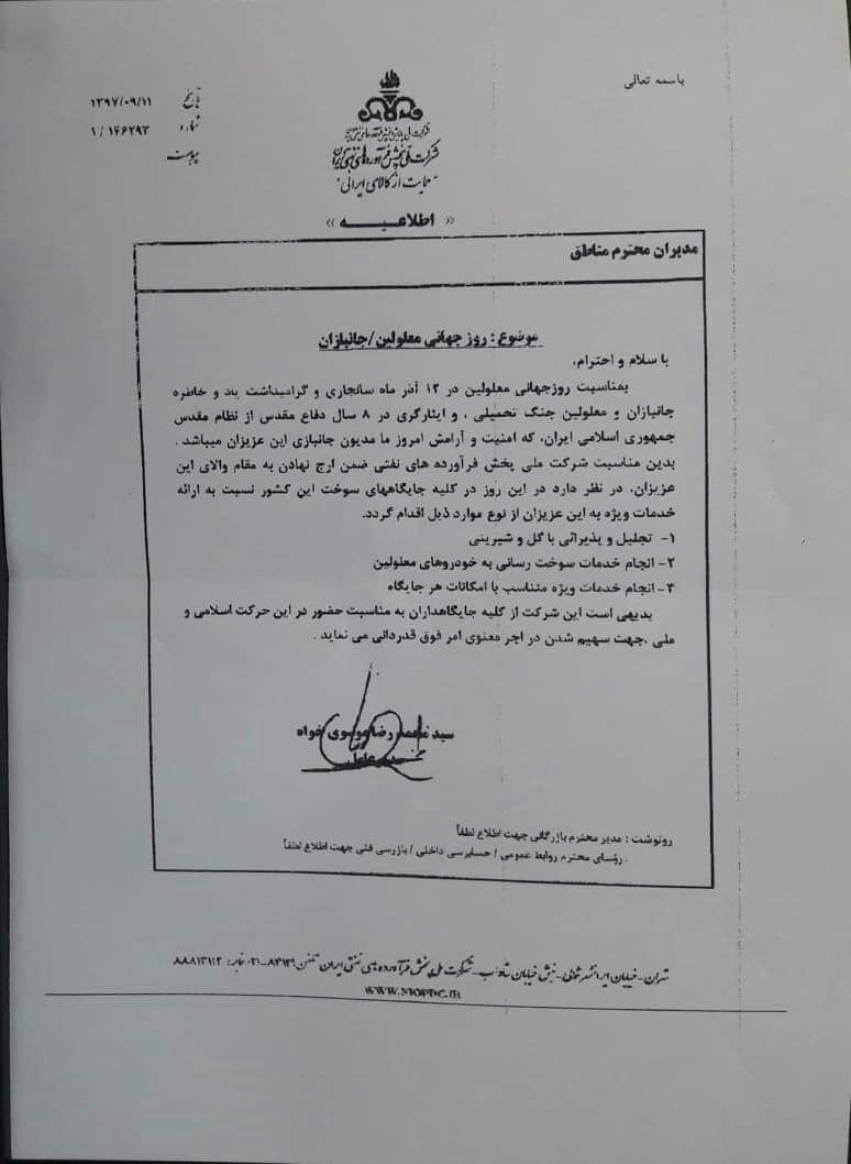براساس این گزارش، شرکت ملی پخش فرآوردهای نفتی ایران به مناسبت روز جهانی معلولین در ۱۲ آذر ماه سالجاری و گرامیداشت یاد و خاطره جانبازان و معلولین جنگ دوران دفاع مقدس و ارج نهادن به مقام والای این عزیزان در بخشنامهای اعلام کرد تا از این افراد در جایگاههای سوخت ضمن انجام سوخت رسانی به خودروهای معلولین از آنها تجلیل شود و خدمات ویژه متناسب با امکانات هر جایگاه به این عزیزان ارائه شود.