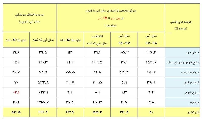 از مجموع ۸۰ میلیمتر بارش ثبت شده در ۷۵ روز ابتدایی سال آبی جاری، ۳۰.۷ میلیمتر بارش در ۱۵ روز نخست آذرماه به ثبت رسیده و این مقدار بارندگی، نهمین ماه سال را به یکی از پربارشترین ماههای سال ۹۷ تبدیل کرده است.