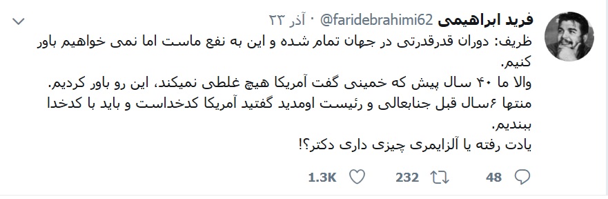 یک فعال رسانه ای در صفحه شخصی خود طی توییتی درباره اظهارات اخیر محمدجواد ظریف وزیر امور خارجه درباره قدرت ایران، نوشت: