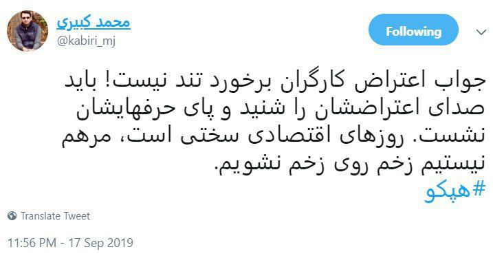 گروه اقتصادی الف، 3980627167 ۲ نظر، ۰ در صف انتشار و ۱ تکراری یا غیرقابل انتشارمحمد کبیری معاون وزیر تعاون، کار و رفاه اجتماعی با اشاره به مطالبات کارگران هپکو طی توئیتی نوشت: جواب اعتراض کارگران برخورد تند نیست! باید صدای اعتراضشان را شنید و پای حرفهایشان نشست. روزهای اقتصادی سختی است، مرهم نیستیم زخم روی زخم نشویم.