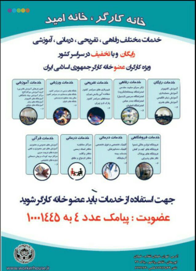 نصیری گفت:تاکنون بیش از 2000مراکز رفاهی ،تفریحی ،علمی ،آموزشی و درمانی دیگر استخرها ،سینماها،درمانگاه ها ،آموزشگاه ها و ...در سراسر کشور می باشند آماده ارائه خدمات تخفیفی به کارگران هستید که کلیه این افراد می توانند بامراجعه به سایت www.workerhouse.ir از آن بهره مند گردند.