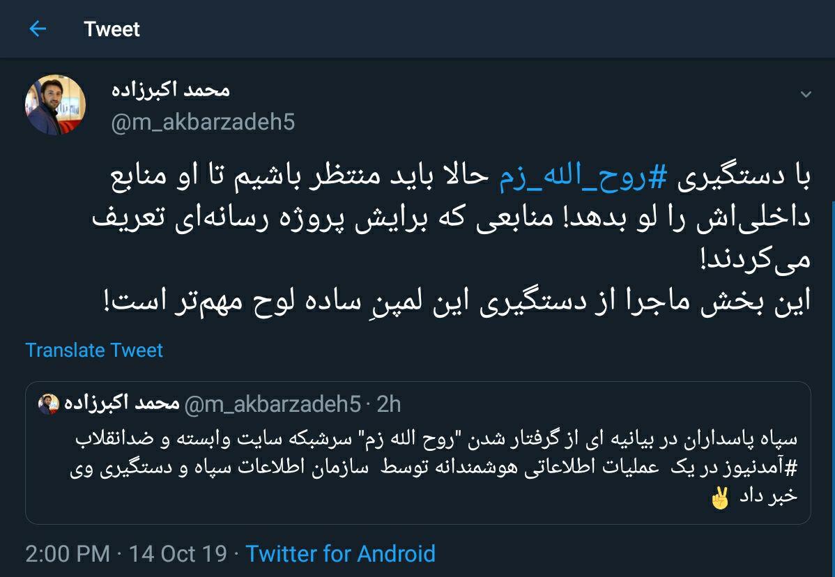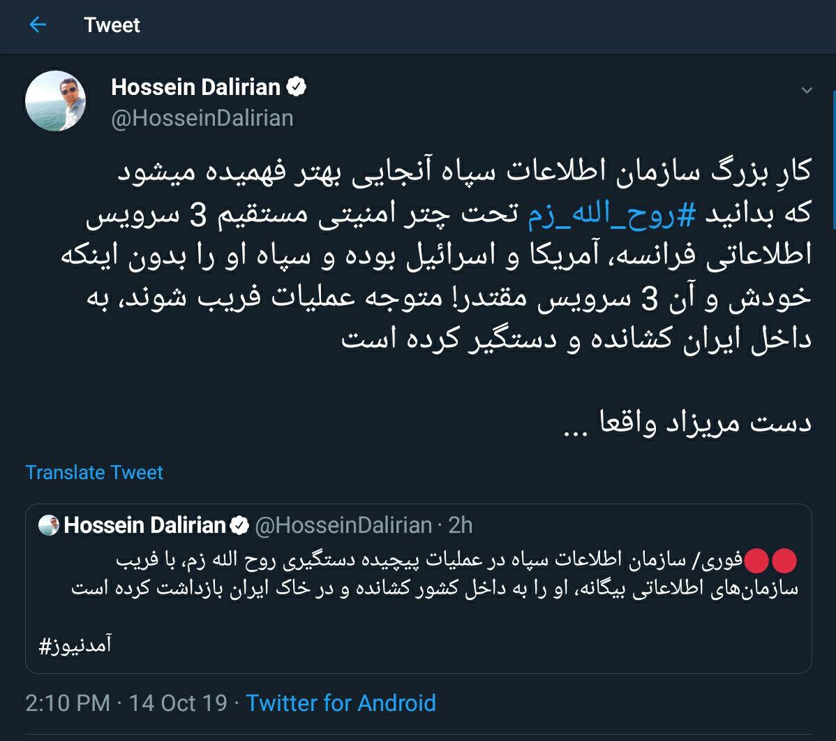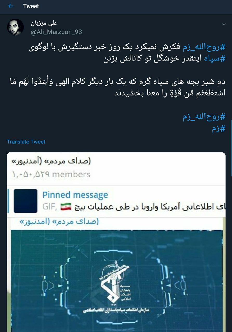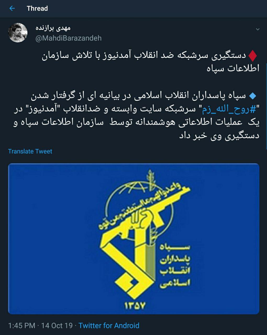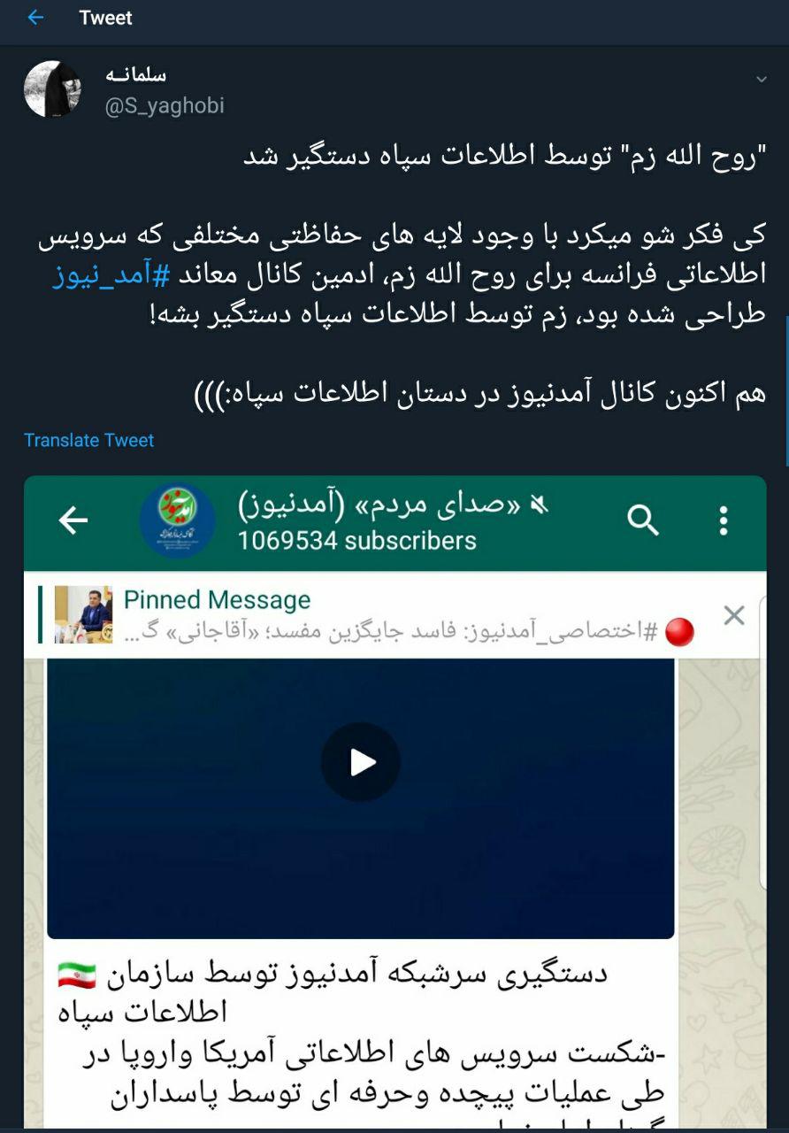 گروه سیاسی الف، 3980722122 ۱۲ نظر، ۰ در صف انتشار و ۶ تکراری یا غیرقابل انتشارسپاه پاسداران انقلاب اسلامی در بیانیهای از گرفتار شدن «روحالله زم» سرشبکه سایت معاند و ضدانقلاب «آمدنیوز» در یک عملیات اطلاعاتی هوشمندانه توسط سازمان اطلاعات سپاه و دستگیری وی خبر داد. واکنش های توییتری به این اتفاق را در ادامه ببینید