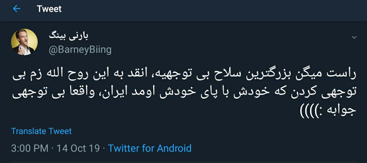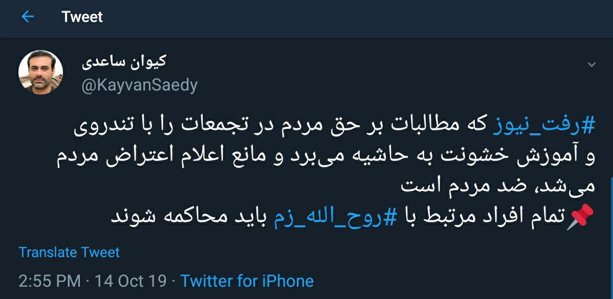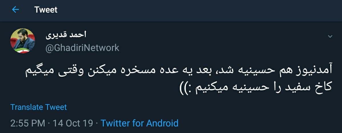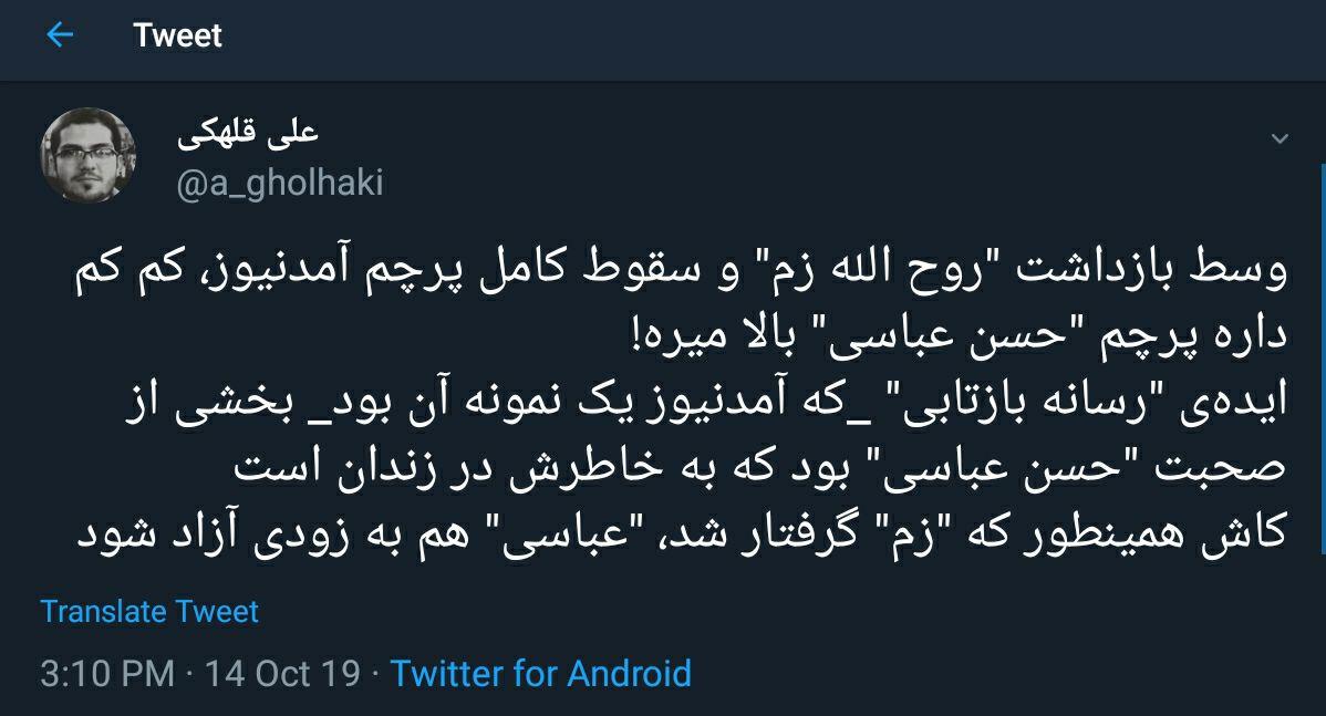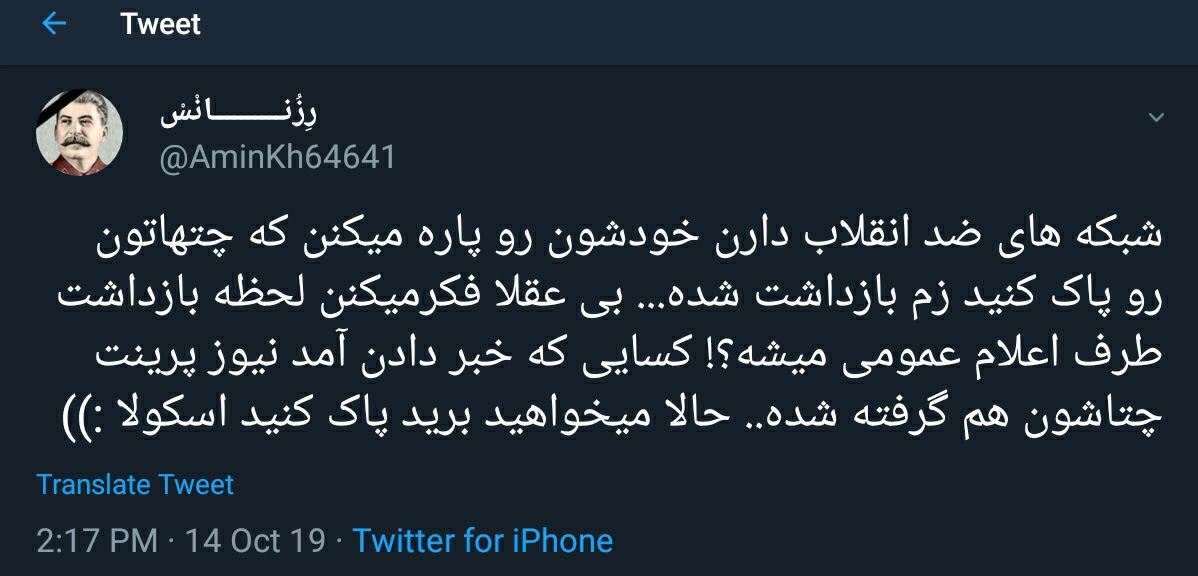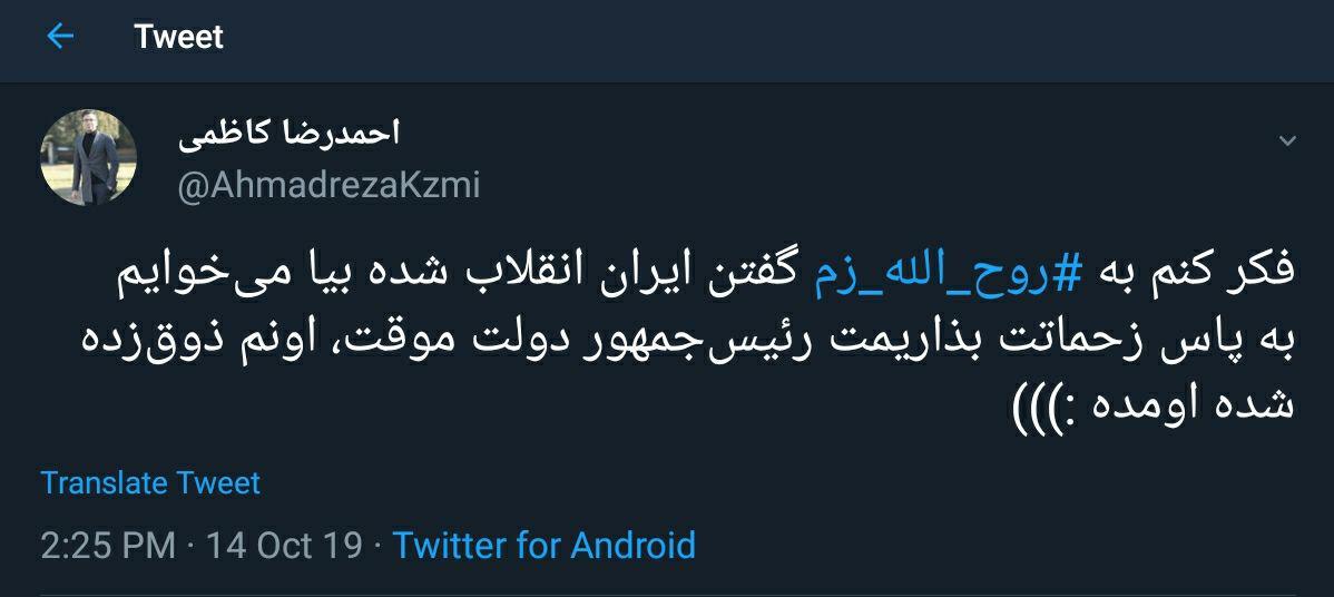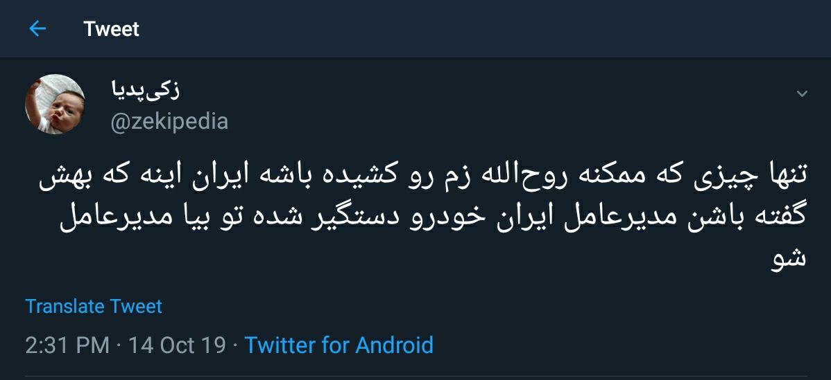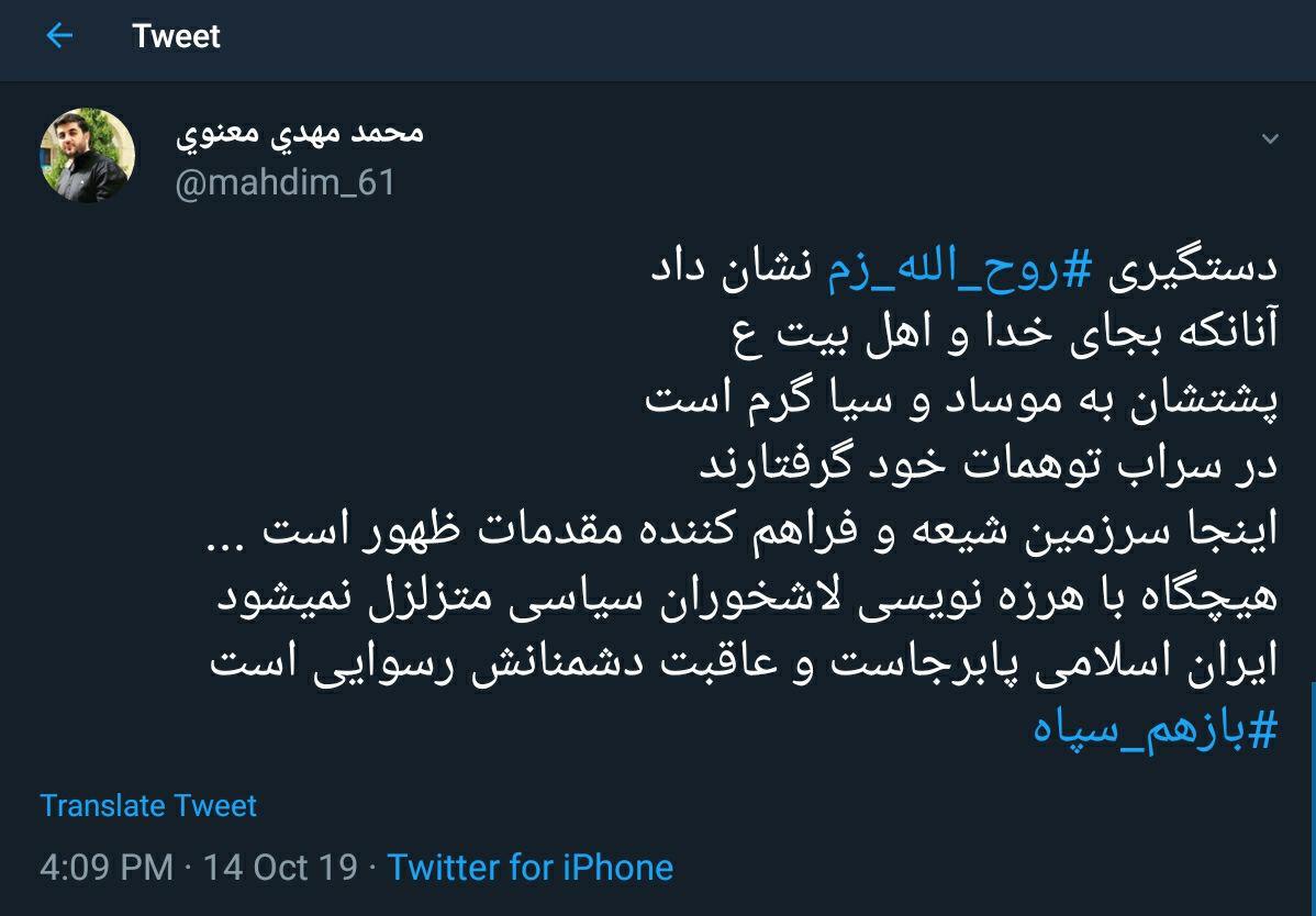 گروه سیاسی الف، 3980722122 ۱۲ نظر، ۰ در صف انتشار و ۶ تکراری یا غیرقابل انتشارسپاه پاسداران انقلاب اسلامی در بیانیهای از گرفتار شدن «روحالله زم» سرشبکه سایت معاند و ضدانقلاب «آمدنیوز» در یک عملیات اطلاعاتی هوشمندانه توسط سازمان اطلاعات سپاه و دستگیری وی خبر داد. واکنش های توییتری به این اتفاق را در ادامه ببینید