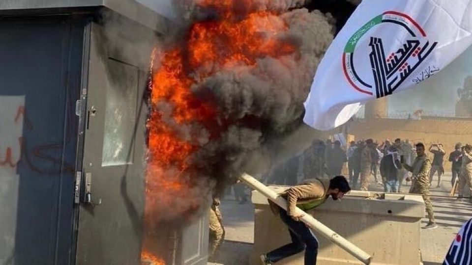 معترضان خشمگین در مراسم تشییع شهدای حشد شعبی بخشهایی از دیوار اصلی سفارت را آتش زدند. معترضان در عین حال پرچمهای آمریکا را مقابل این سفارتخانه به آتش کشیدند.