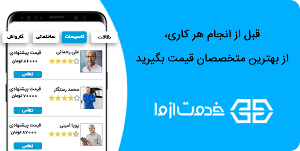 قبل از شروع هر کاری، قیمت خدماتی را که میخواهید دریافت کنید را از متخصصینش بپرسید. سفارش خود را در وب سایت (https://khedmatazma.com) یا اپلیکیشن «خدمت از ما» به رایگان ثبت کنید. پس از ثبت سفارش خدمت موردنیازتان، از حداقل 3 متخصص پیشنهاد قیمت دریافت میکنید. با متخصصین به گفتگو بپردازید و در صورت نیاز با او تماس بگیرید تا به خوبی اطلاعات موردنظر را رد و بدل کنید. حتی میتوانید قیمتهای پیشنهادی را مقایسه کنید و پروفایل متخصصین را بررسی کنید. در پروفایل متخصص، حتما نظرات مشتریان قبلی آنها را خواهید دید. نظرات مردم را بخوانید تا انتخاب بهتری داشته باشید.