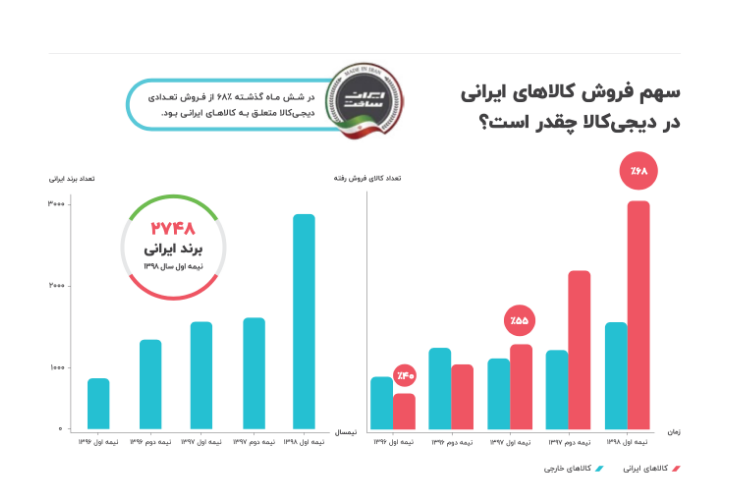 در حال حاضر ۲۷۴۸ برند ایرانی در دیجیکالا وجود دارد. همین مسئله امروز باعث شده تا ۶۸ درصد از سهم فروش محصولات مختلف در دیجیکالا، متعلق به برندهای ایرانی باشد. این در حالیست که دو سال پیش، تقریباً این معادله برعکس بوده و سهم فروش محصولات خارجی بیشتر از محصولات داخلی بوده است.